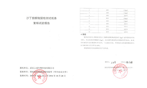 2016年10月26日,上成生物將苯乙醇胺A殘留檢測(cè)試紙條、克倫特羅殘留檢測(cè)試紙條、萊克多巴胺殘留檢測(cè)試紙條和沙丁胺醇?xì)埩魴z測(cè)試紙條四款膠體金檢測(cè)試紙條送到國(guó)家獸藥殘留基準(zhǔn)實(shí)驗(yàn)室(華中農(nóng)業(yè)大學(xué))做復(fù)核實(shí)驗(yàn)。實(shí)驗(yàn)內(nèi)容包括:檢測(cè)限、假陽(yáng)性率、假陰性率和儀器對(duì)比。經(jīng)過(guò)實(shí)驗(yàn)檢測(cè)產(chǎn)品全部達(dá)到國(guó)家標(biāo)準(zhǔn)。