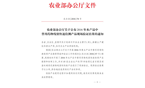 根據(jù)《農(nóng)業(yè)部辦公廳關(guān)于開(kāi)展2016年度水產(chǎn)品中禁用藥物快速檢測(cè)產(chǎn)品推薦篩選和驗(yàn)證工作的通知》(農(nóng)辦漁〔2016〕57號(hào))部署,農(nóng)業(yè)部組織開(kāi)展了2016年水產(chǎn)品中禁用藥物殘留快速檢測(cè)產(chǎn)品推薦和初審工作,上成生物送檢產(chǎn)品全部通過(guò)現(xiàn)場(chǎng)驗(yàn)證。