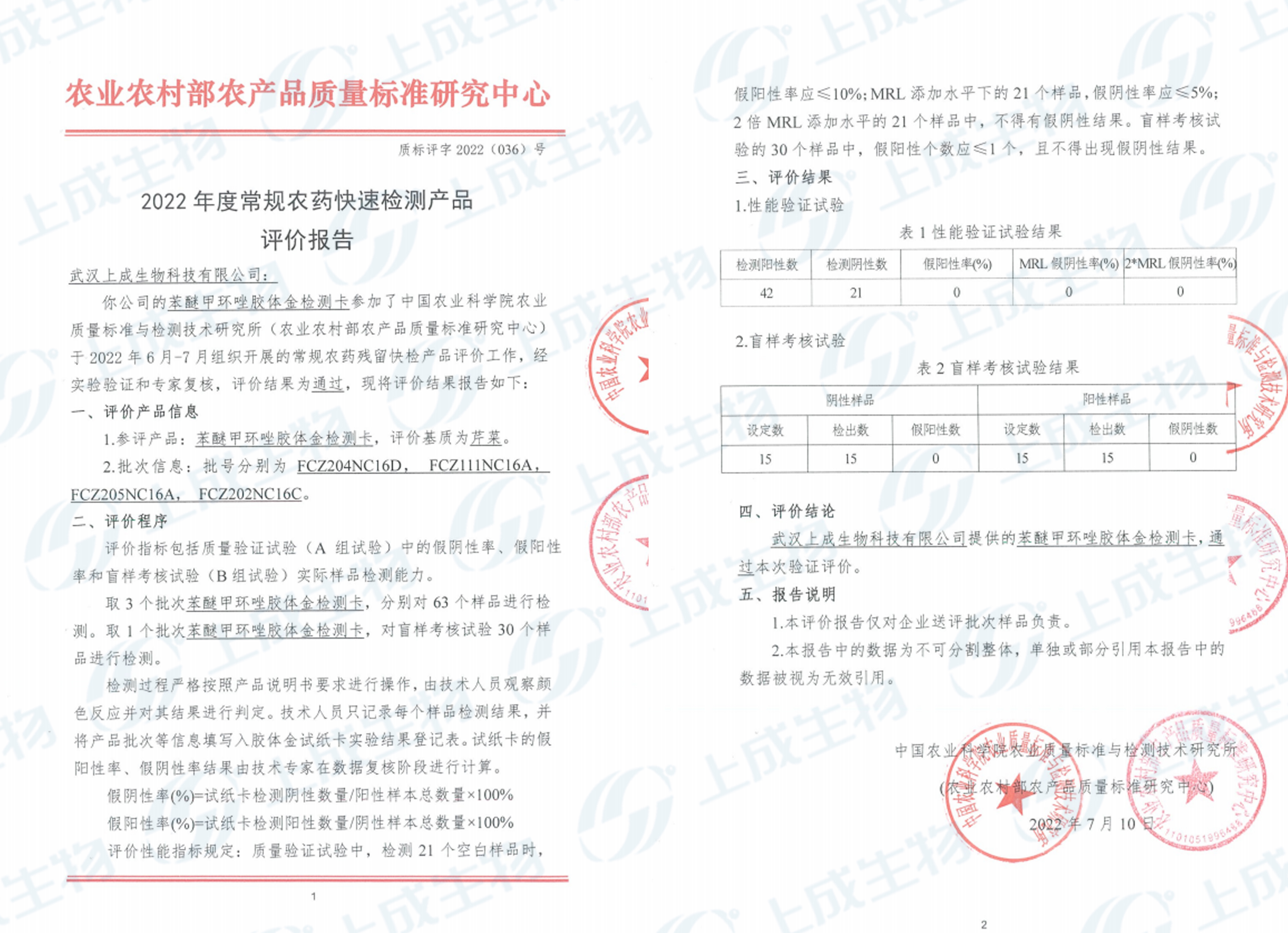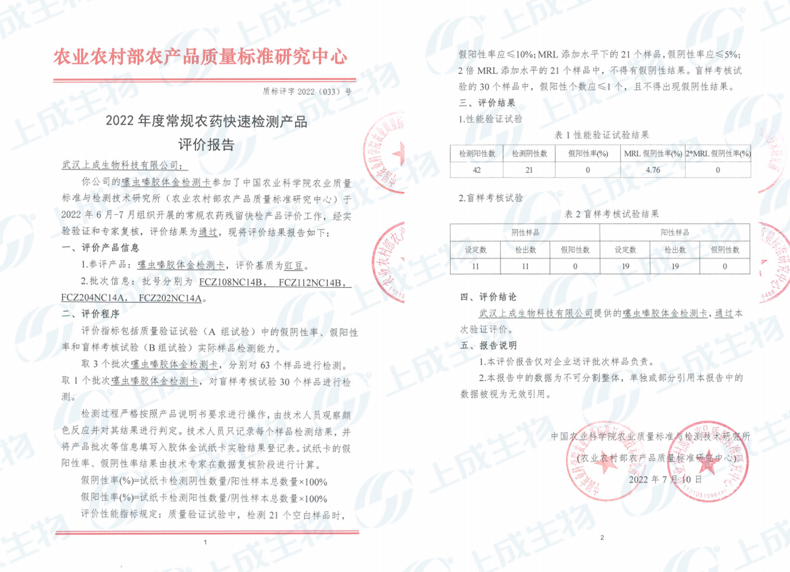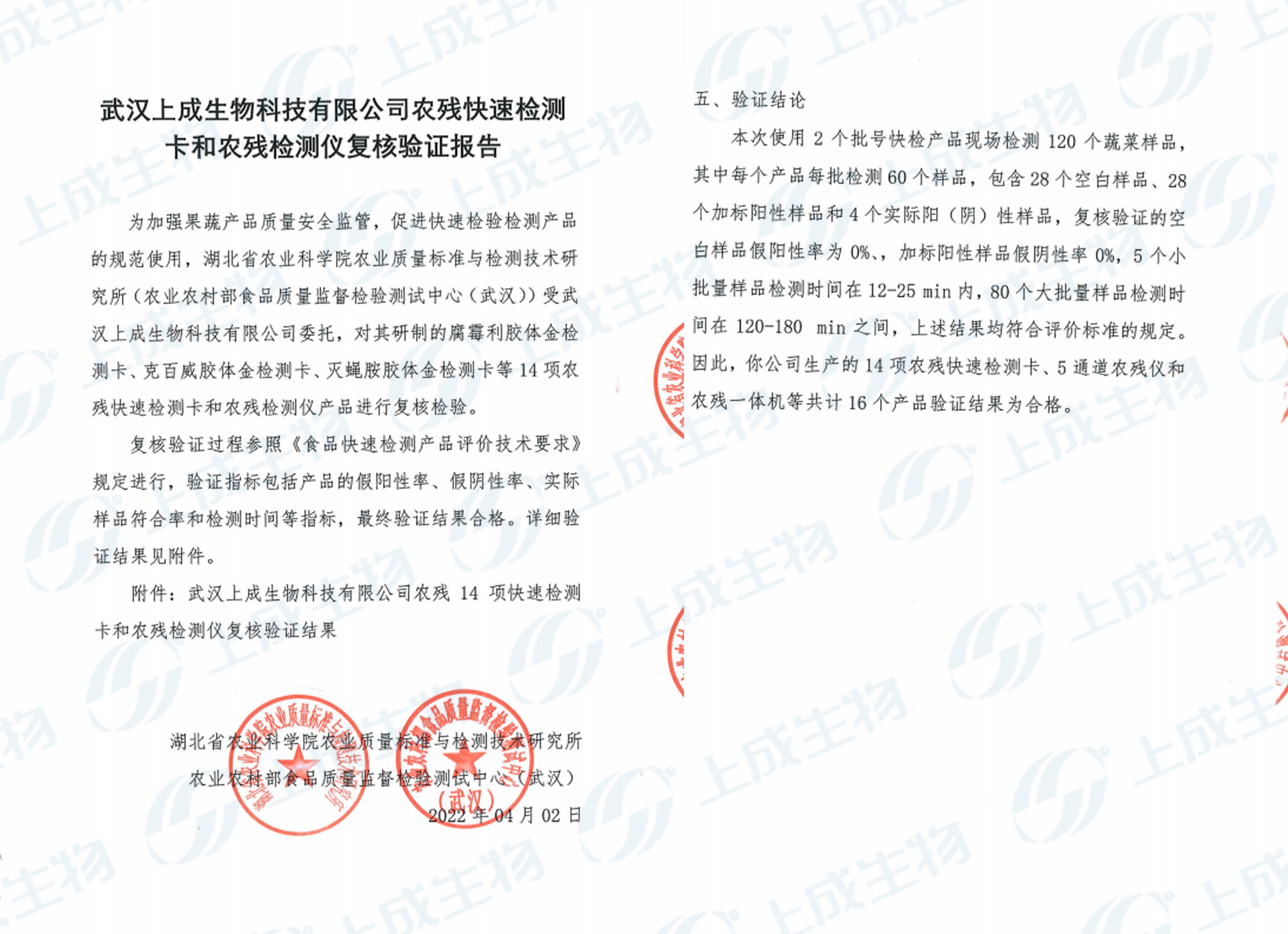 2022年4月2日,武漢上成生物研制的腐霉利膠體金檢測卡、克百威膠體金檢測卡、滅蠅胺膠體金檢測卡等14項農(nóng)殘快速檢測卡和農(nóng)殘檢測儀產(chǎn)品通過農(nóng)業(yè)農(nóng)村部食品質(zhì)量監(jiān)督檢驗測試中心符合檢驗,假陽性率0%,假陰性率0%。