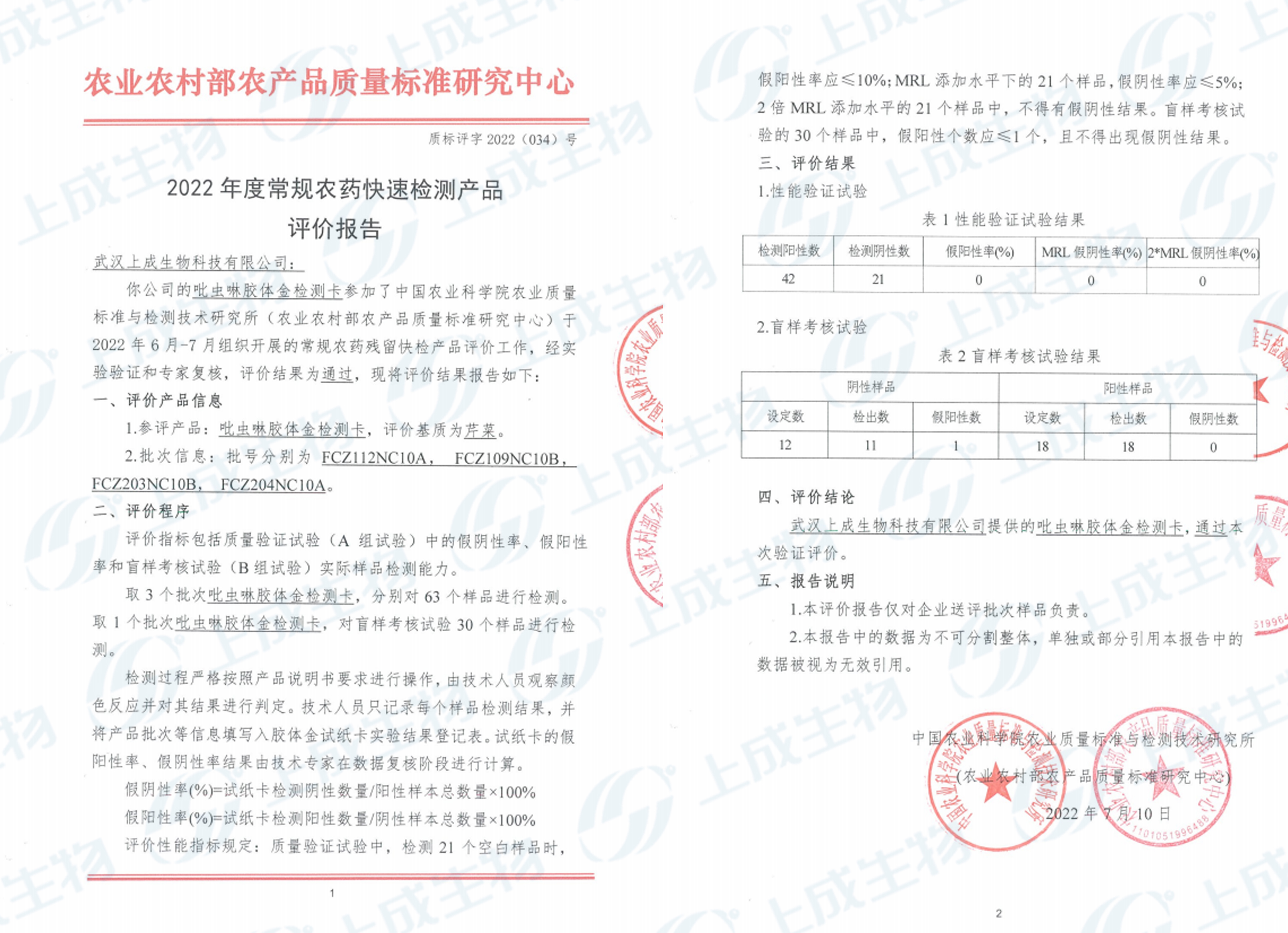 2022年7月10日,上成生物產(chǎn)品吡蟲啉膠體金檢測卡通過農(nóng)業(yè)農(nóng)村部產(chǎn)品質(zhì)量標(biāo)準(zhǔn)研究中心復(fù)核驗證。