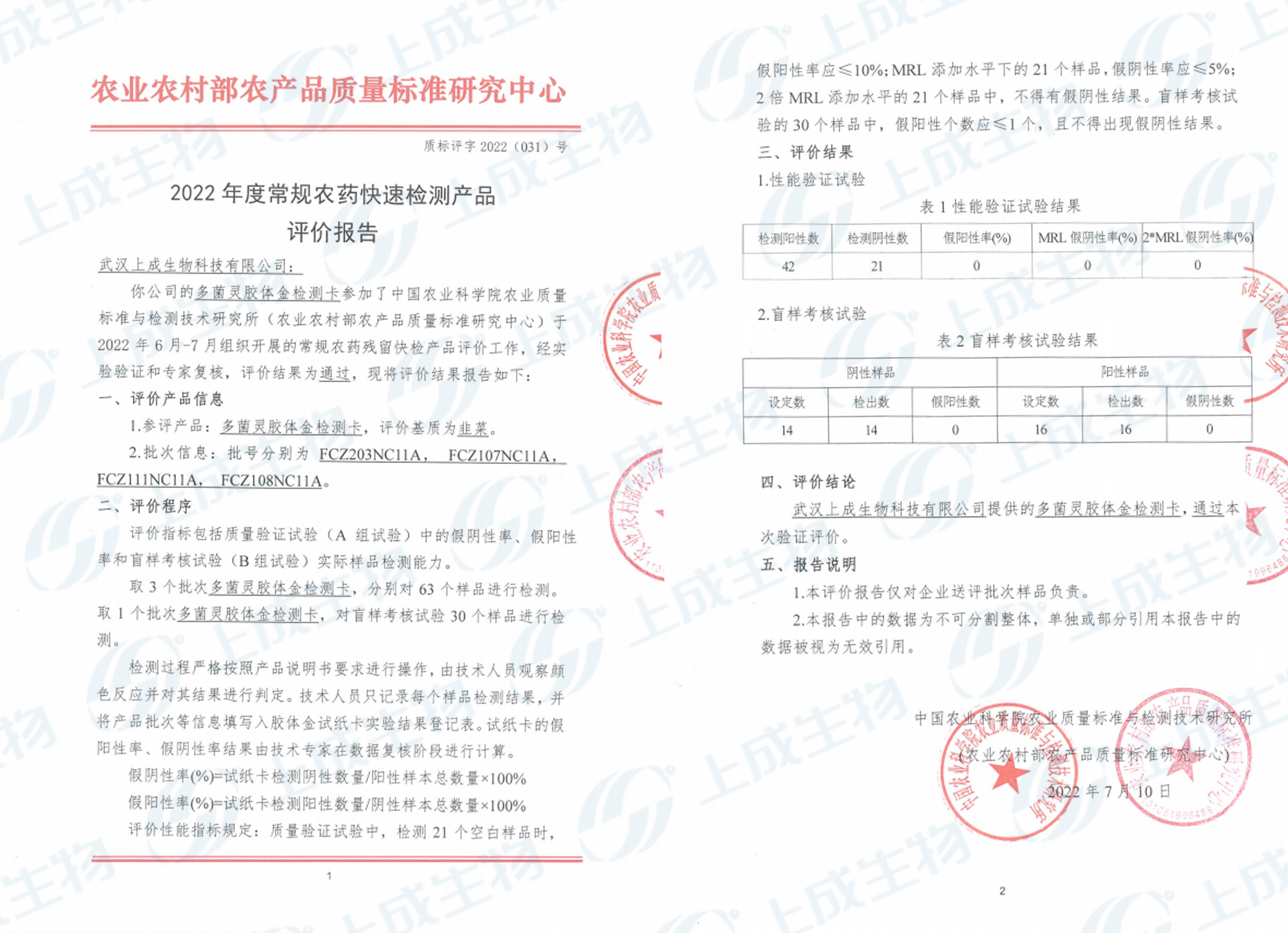 2022年7月10日,上成生物產(chǎn)品多菌靈膠體金檢測卡通過農(nóng)業(yè)農(nóng)村部產(chǎn)品質(zhì)量標(biāo)準(zhǔn)研究中心復(fù)核驗證。