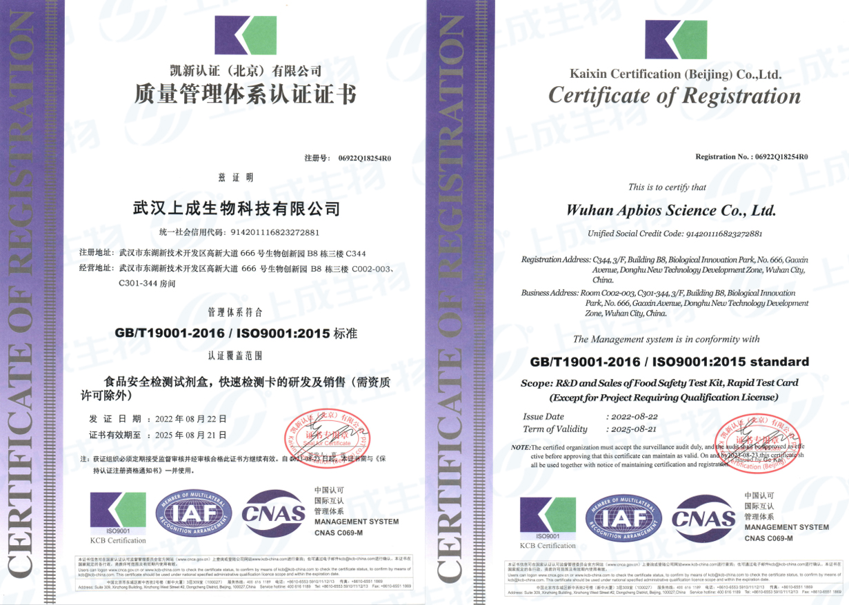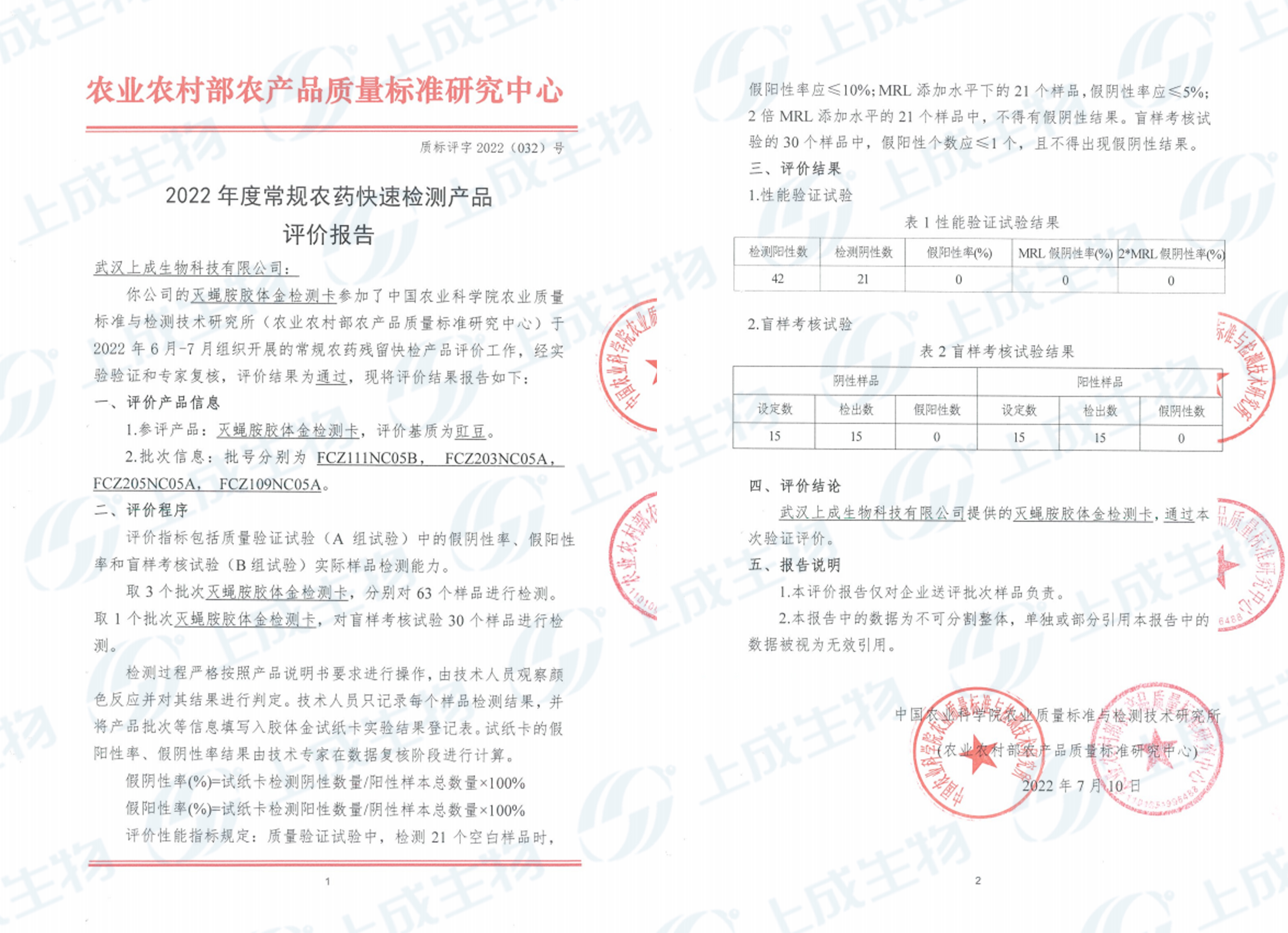 2022年4月2日,武漢上成生物研制的腐霉利膠體金檢測卡、克百威膠體金檢測卡、滅蠅胺膠體金檢測卡等14項農(nóng)殘快速檢測卡和農(nóng)殘檢測儀產(chǎn)品通過農(nóng)業(yè)農(nóng)村部食品質(zhì)量監(jiān)督檢驗測試中心符合檢驗,假陽性率0%,假陰性率0%。