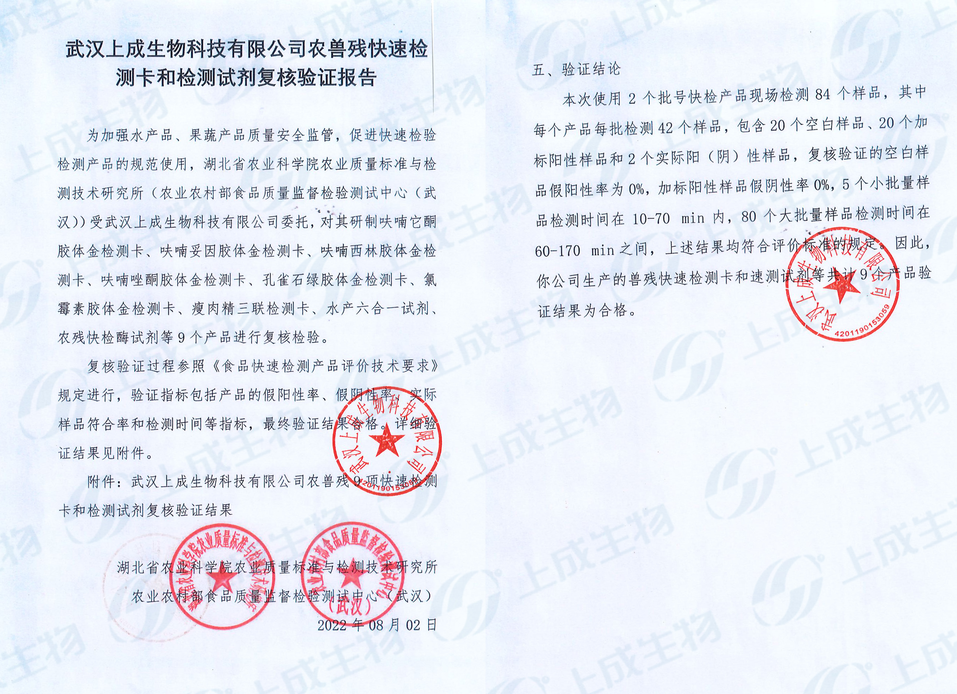 2022.08.02武漢上成生物研制的呋喃它酮代謝物、呋喃妥因代謝物、呋喃西林代謝物、呋喃唑酮代謝物膠體金檢測卡、孔雀石綠膠體金檢測卡、氯霉素膠體金檢測卡、瘦肉精三聯(lián)檢測卡、水產(chǎn)六合一試劑等產(chǎn)品通過農(nóng)業(yè)農(nóng)村部食品質(zhì)量監(jiān)督檢測測試中心符合檢驗,假陽性率為0%。