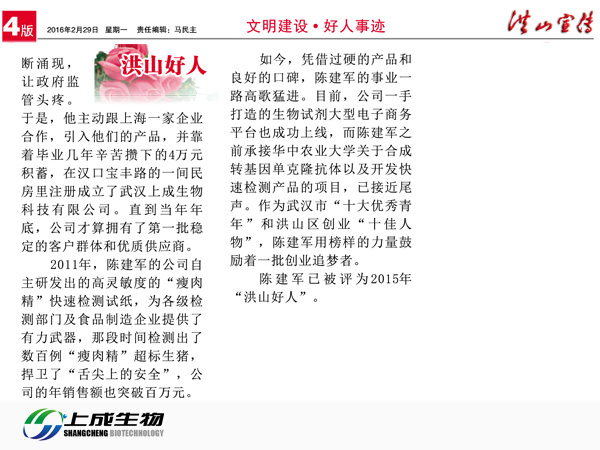 2009年初,陳建軍迎來了事業(yè)的轉機。他發(fā)現(xiàn),那段時間國內(nèi)瘦肉精問題不斷涌現(xiàn),讓政府監(jiān)管頭疼。于是,他主動跟上海一家企業(yè)合作,引入他們的產(chǎn)品,并靠著畢業(yè)幾年辛苦攢下來的4萬元積蓄,在漢口寶豐路一間民房注冊成立了武漢上成生物科技有限公司。直到當年年底,公司才算是擁有了第一批穩(wěn)定的客戶群體和優(yōu)質(zhì)供應商。