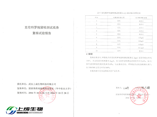 2016年10月26日,上成生物將苯乙醇胺A殘留檢測試紙條、克倫特羅殘留檢測試紙條、萊克多巴胺殘留檢測試紙條和沙丁胺醇殘留檢測試紙條四款膠體金檢測試紙條送到國家獸藥殘留基準實驗室(華中農(nóng)業(yè)大學)做復核實驗。實驗內(nèi)容包括:檢測限、假陽性率、假陰性率和儀器對比。經(jīng)過實驗檢測產(chǎn)品全部達到國家標準。