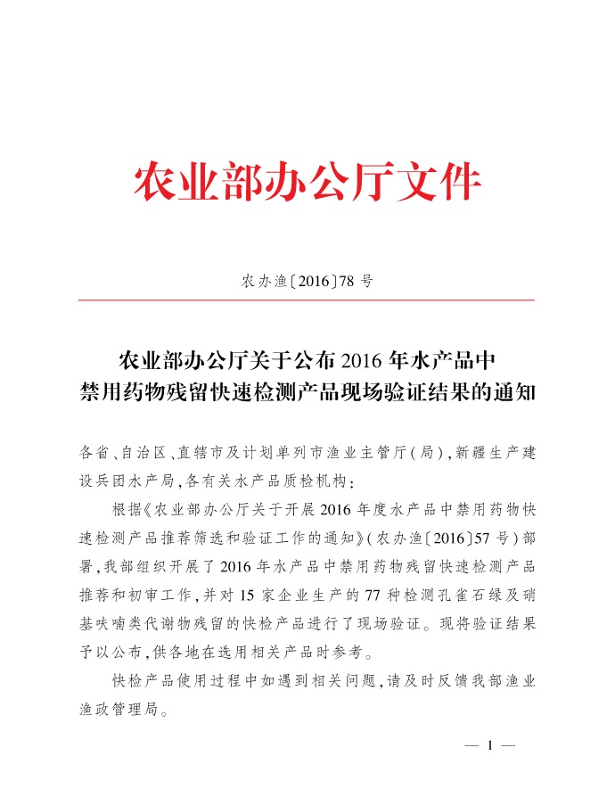 根據(jù)《農(nóng)業(yè)部辦公廳關(guān)于開(kāi)展2016年度水產(chǎn)品中禁用藥物快速檢測(cè)產(chǎn)品推薦篩選和驗(yàn)證工作的通知》(農(nóng)辦漁〔2016〕57號(hào))部署,農(nóng)業(yè)部組織開(kāi)展了2016年水產(chǎn)品中禁用藥物殘留快速檢測(cè)產(chǎn)品推薦和初審工作,并對(duì)15家企業(yè)生產(chǎn)的77種檢測(cè)孔雀石綠及硝基呋喃類(lèi)代謝物殘留的快檢產(chǎn)品進(jìn)行了現(xiàn)場(chǎng)驗(yàn)證。
