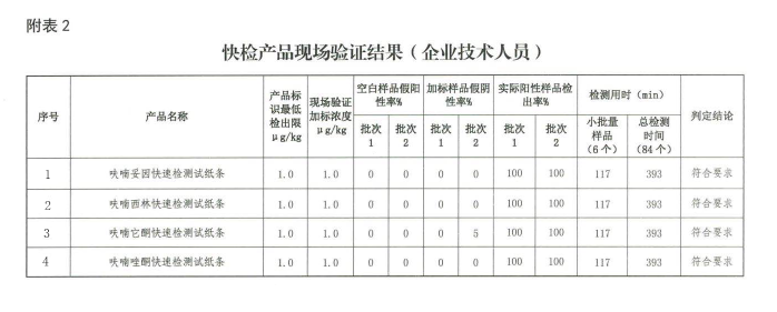 水產(chǎn)品驗證是按照農(nóng)業(yè)農(nóng)村部關于開展《2018年度水產(chǎn)品中禁用藥物殘留快速檢測產(chǎn)品推薦篩選和驗證工作的通知》(農(nóng)漁科函[2018]76號)要求,在農(nóng)業(yè)農(nóng)村部水產(chǎn)品質(zhì)檢中心(上海)現(xiàn)場開展驗證,驗證指標包括產(chǎn)品的假陽性率、假陰性率、實際陽性樣品檢出率和檢測時間等。